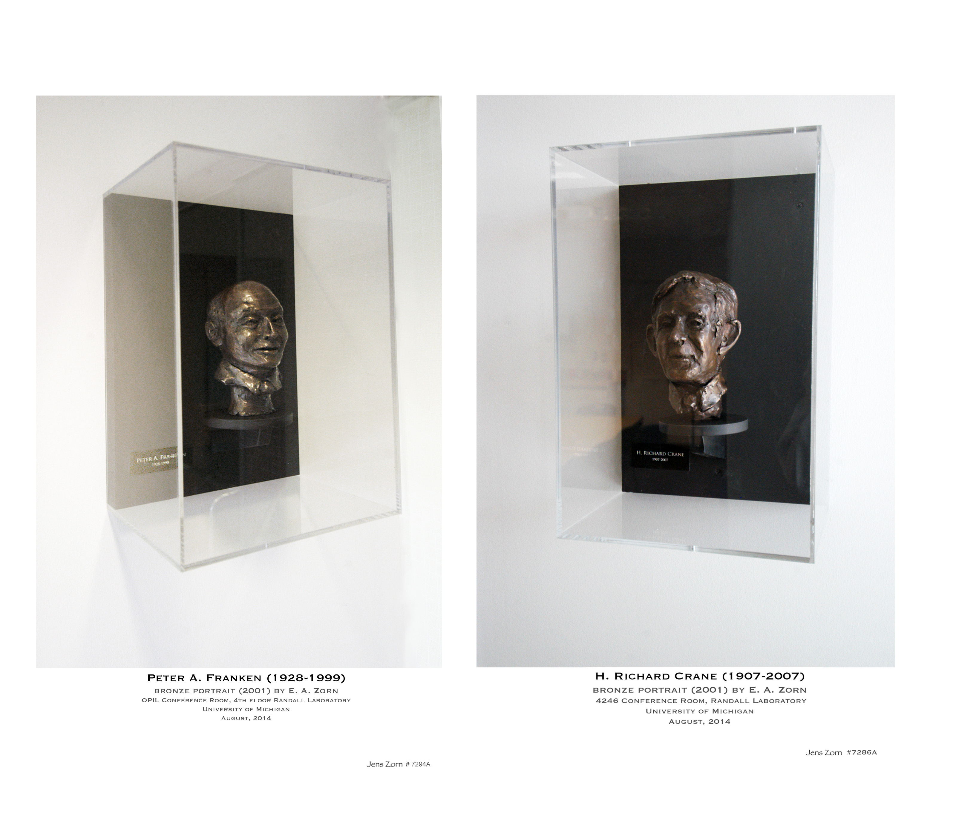 To honor the enormous contributions of Dick Crane and Peter Franken to our department, we have installed bronze portrait busts of them in the 4th floor conference rooms (4246 and OPIL) of New Randall Lab. The sculptor is Liz Zorn, the sister of Jens.